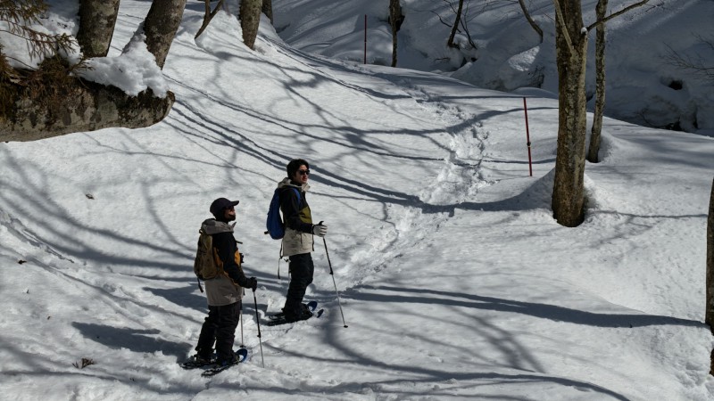小川沿いの静かな雪道を歩き、スキー場内の森を抜け、一部ゲレンデを登る、変化に富んだルート。